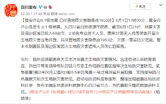 | 雅安芦山6.1级地震 已排查地质灾害隐患点1953处 |